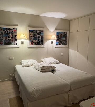 Le niveau jardin offre un jardin privatif plein sud, une grande chambre familiale (lit double + 2 lits simples) avec salon TV, une chambre double, une salle de bain avec douche et toilette, ainsi qu’une buanderie.